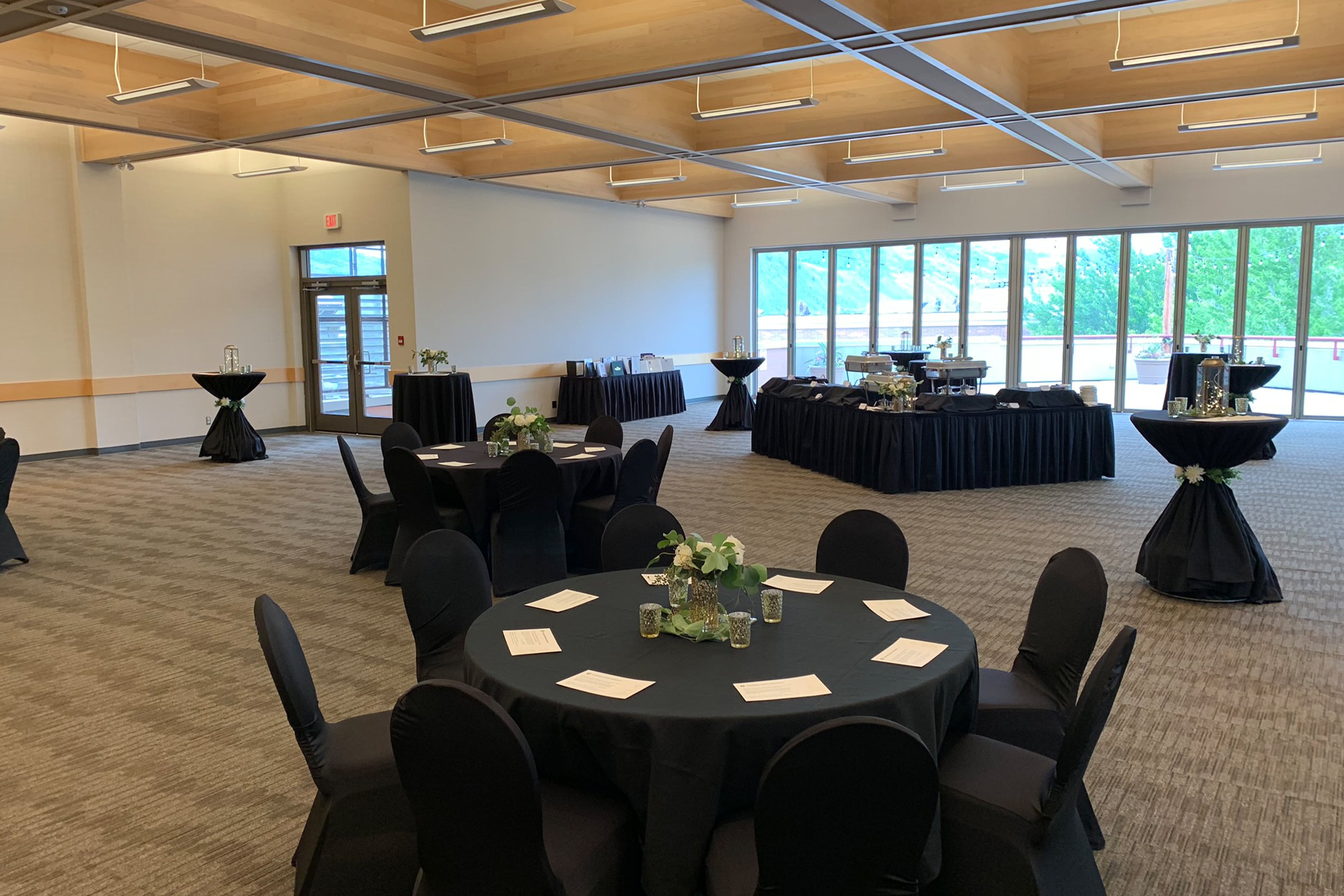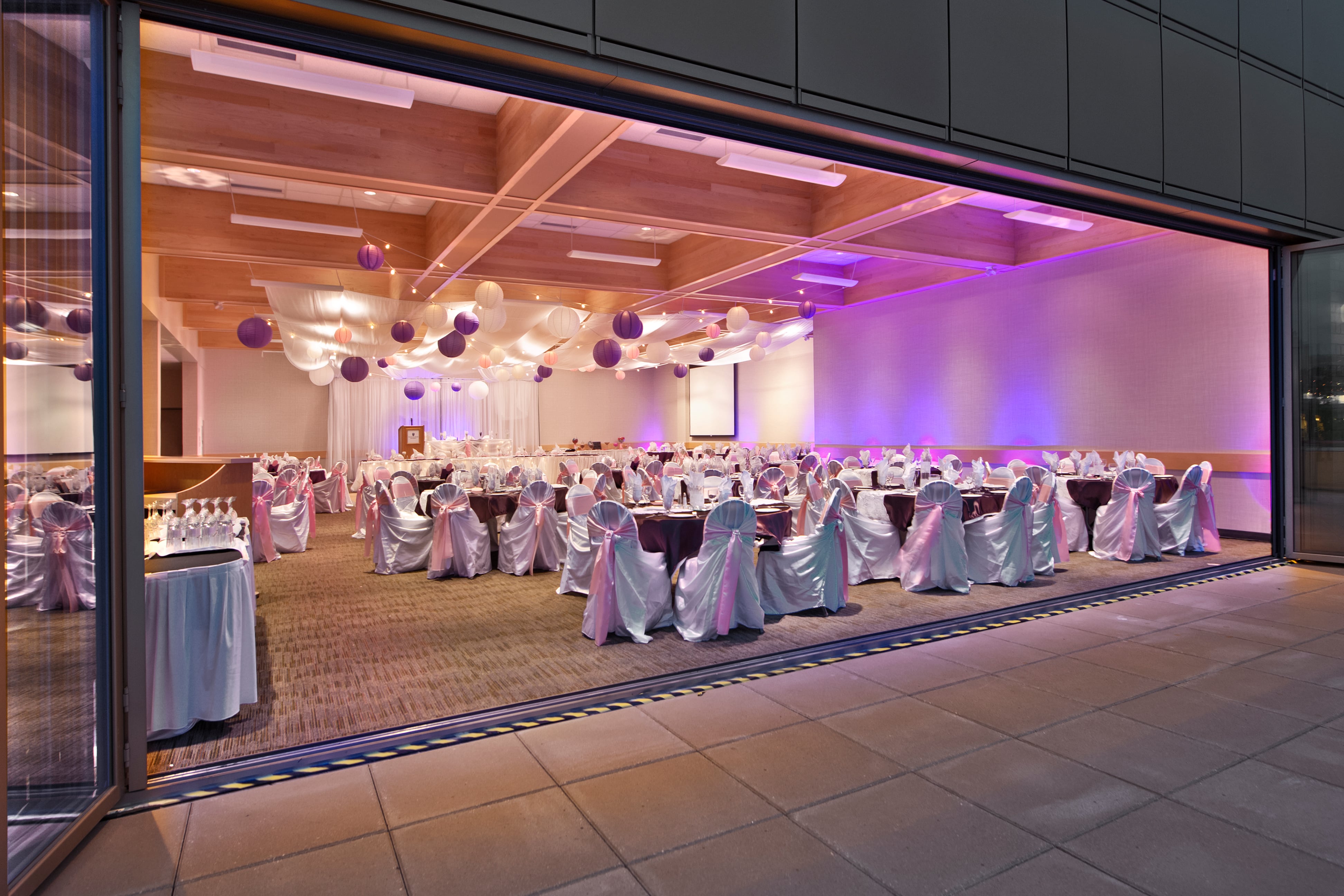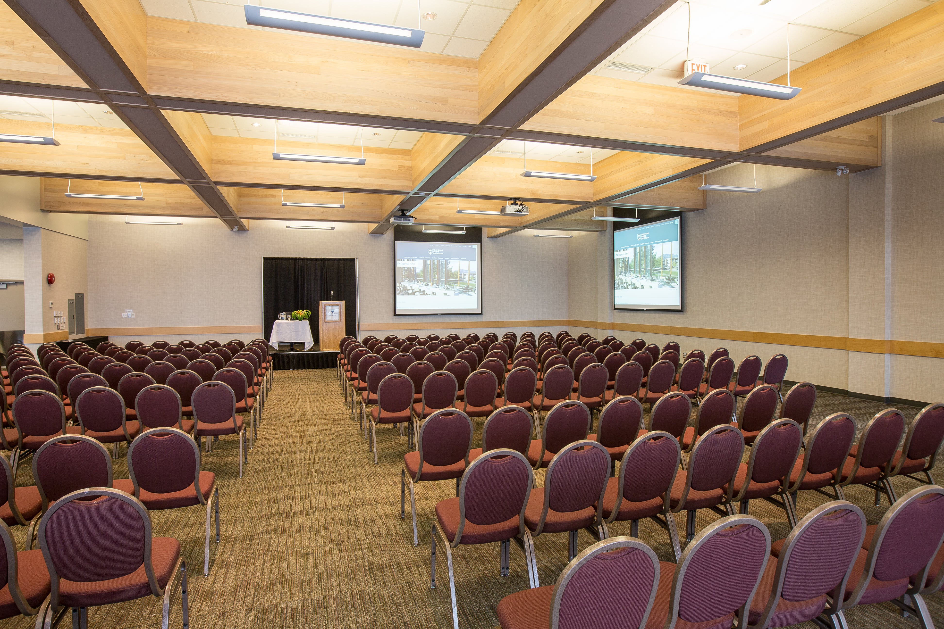 This elegant and versatile room creates a powerful first impression. Natural light floods the room from a fully retractable wall of windows that open up to a large private patio, providing a beautiful view of the campus commons and surrounding Kamloops mountain scape. Ideal for creating an indoor/outdoor event atmosphere perfect for social gatherings, conferences, special events and weddings.