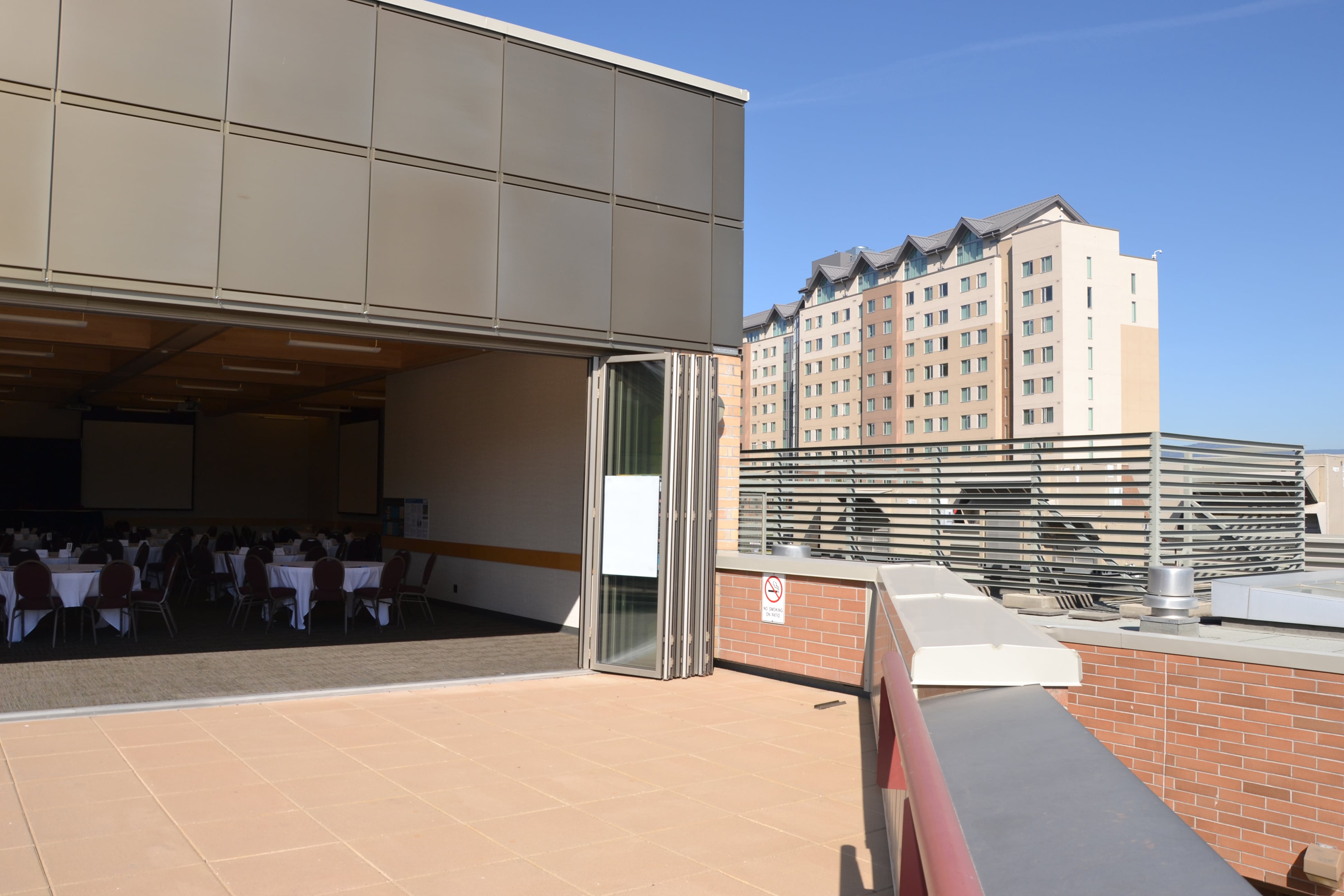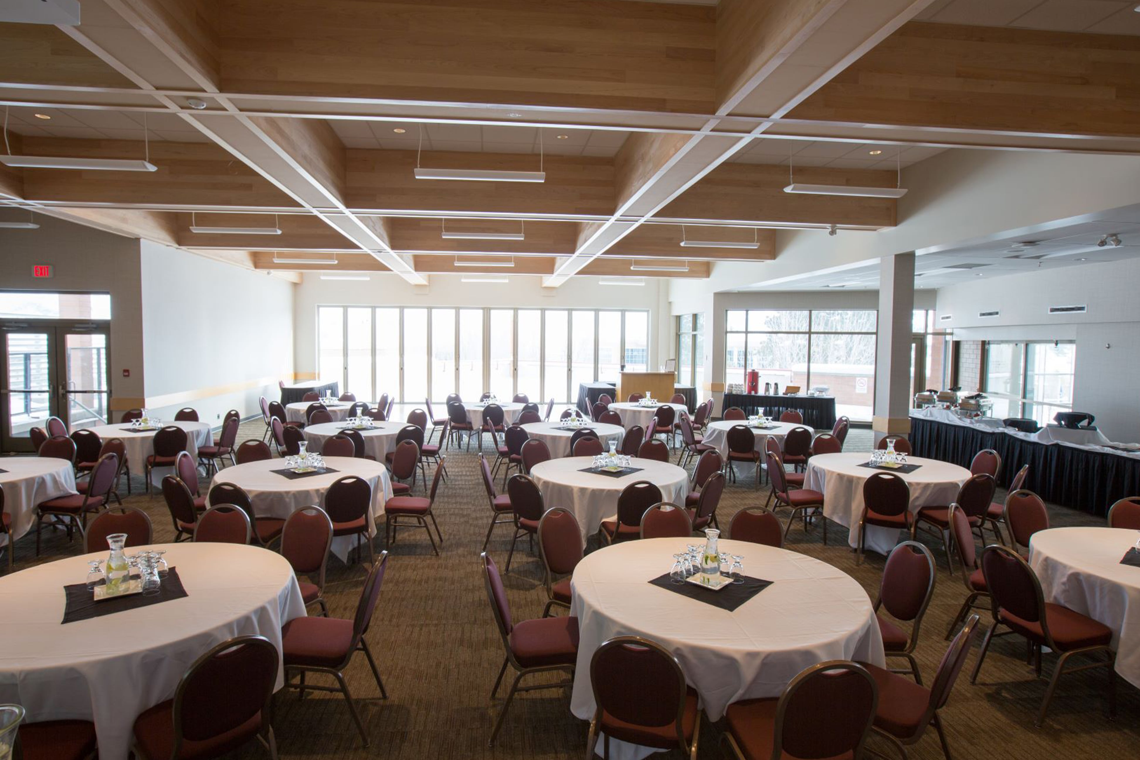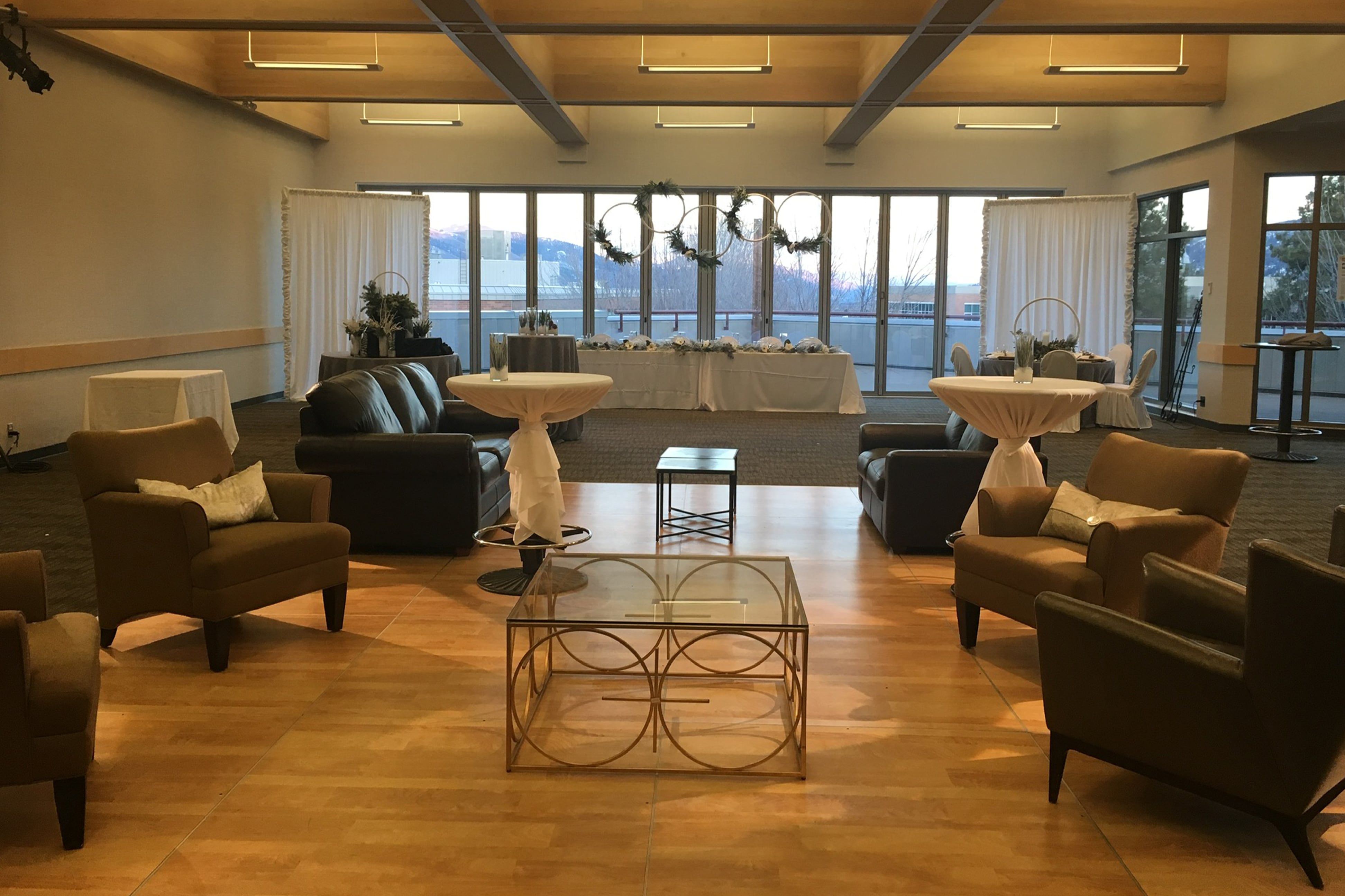 This elegant and versatile room creates a powerful first impression. Natural light floods the room from a fully retractable wall of windows that open up to a large private patio, providing a beautiful view of the campus commons and surrounding Kamloops mountain scape. Ideal for creating an indoor/outdoor event atmosphere perfect for social gatherings, conferences, special events and weddings.