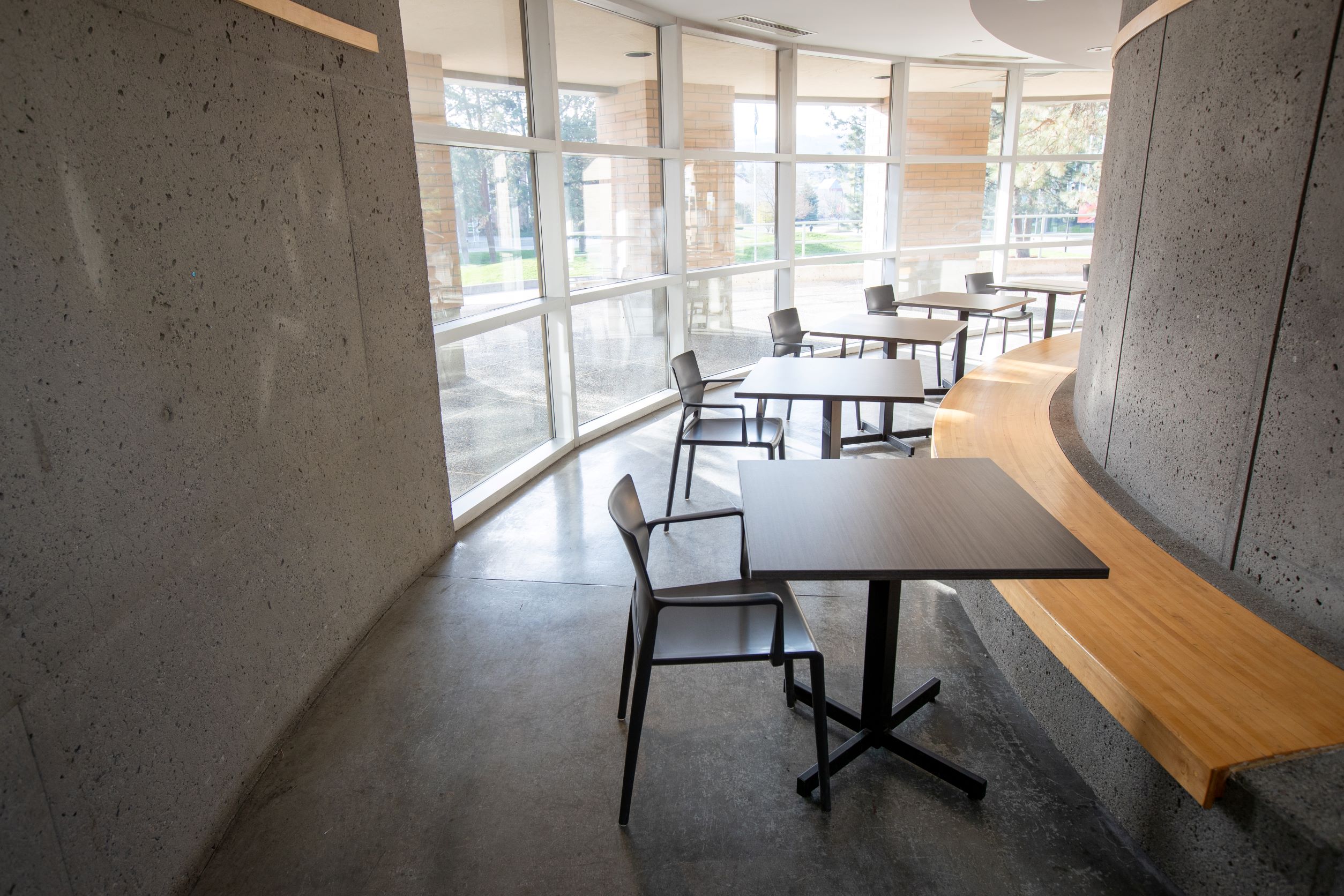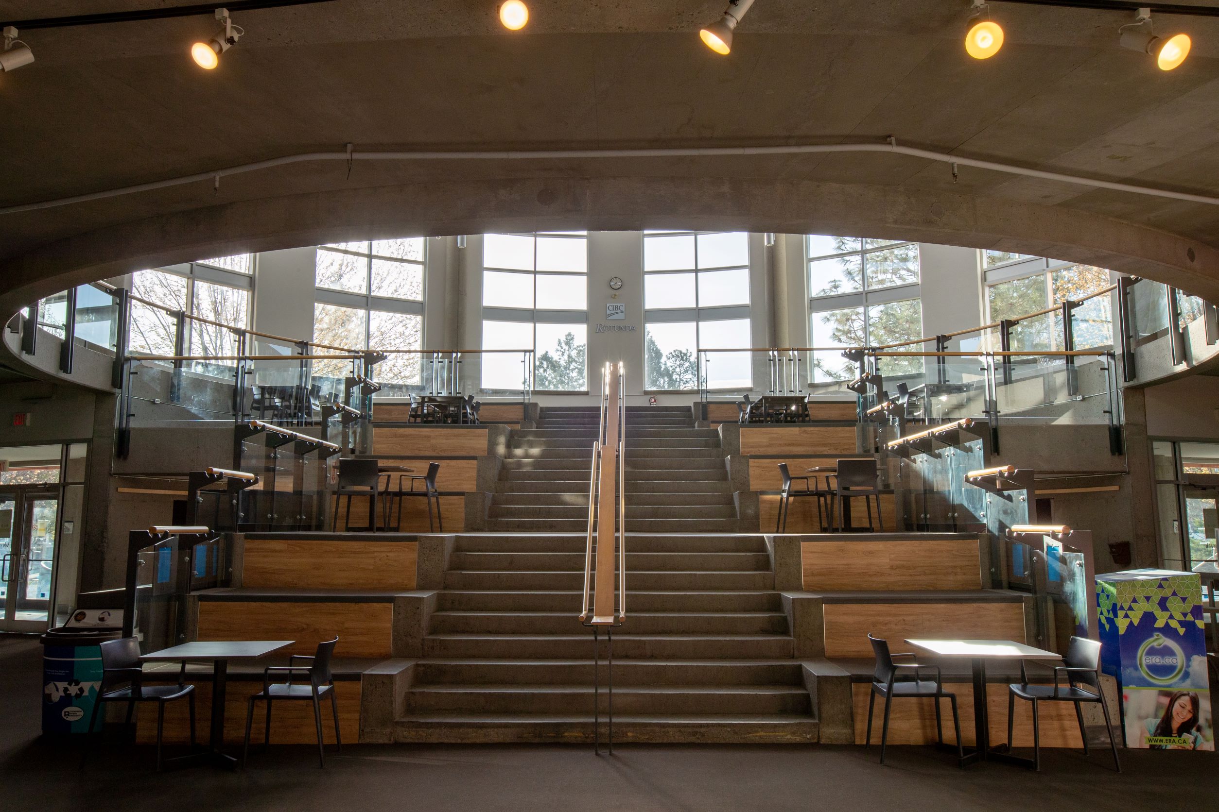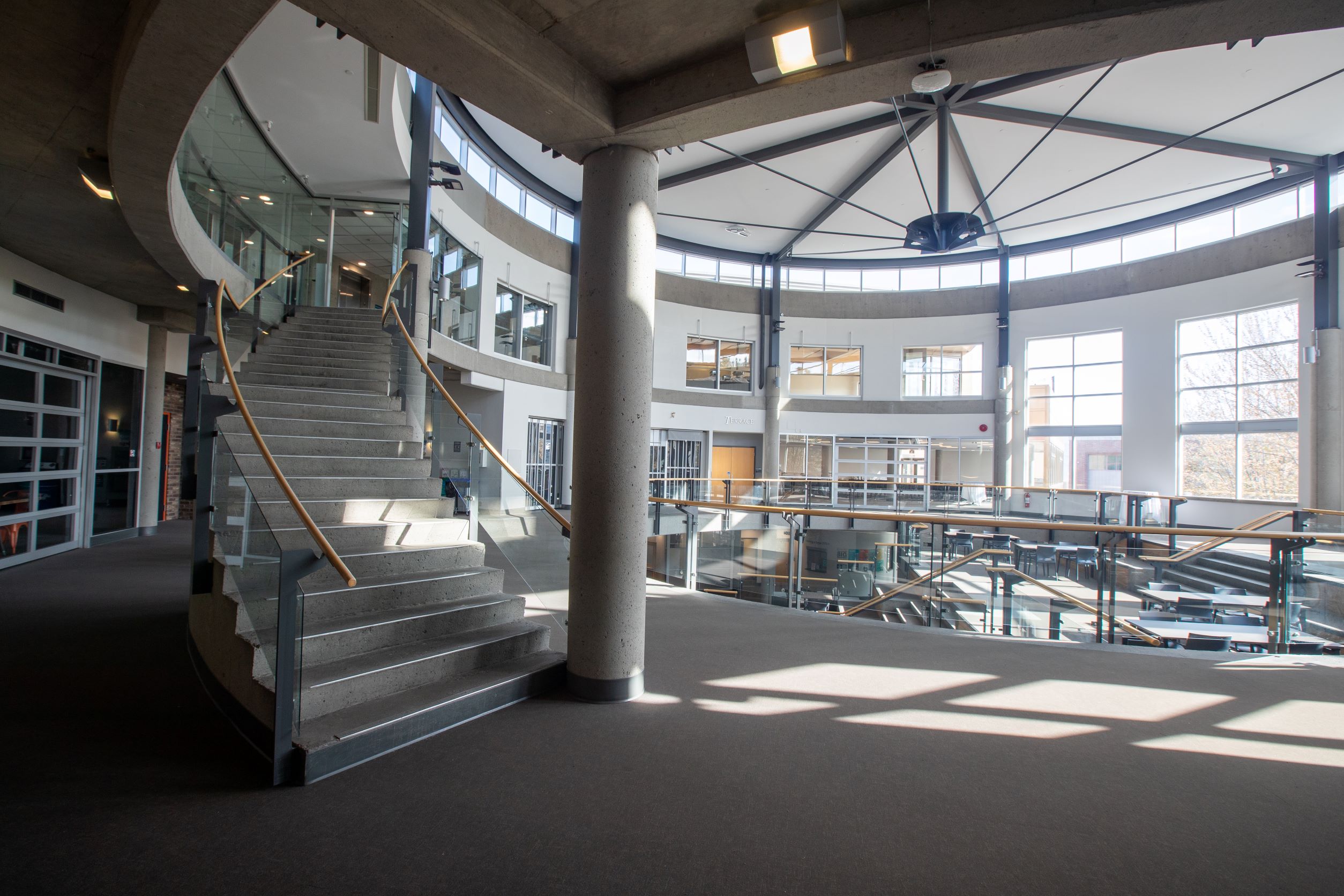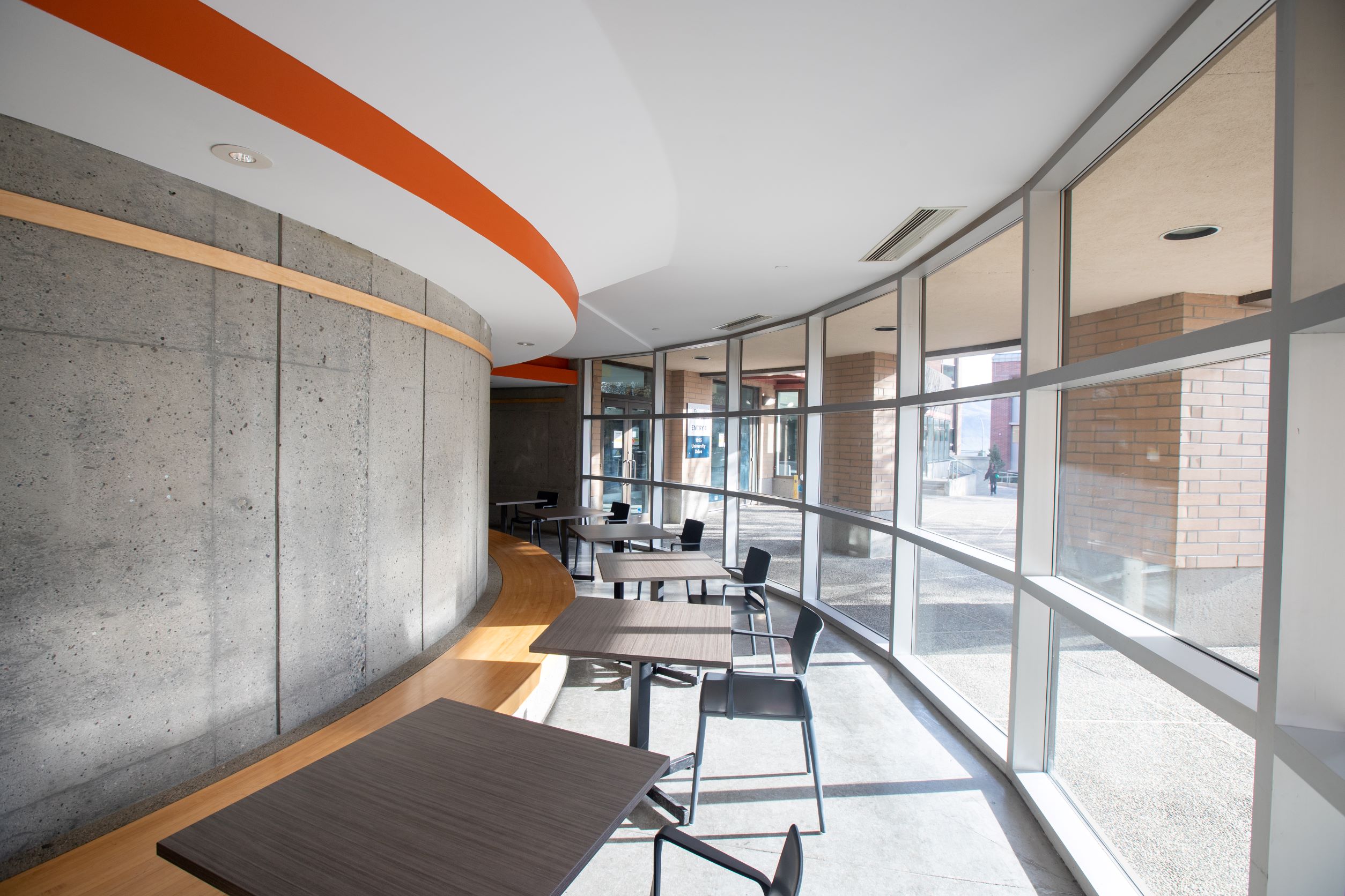 A unique event space at the heart of the Campus Activity Centre, this space has a modern look with wood and brick features, making for a beautiful background to your event. This circular space acts as the main communal area of the building and features large windows that allow for ample natural light, bringing the outside in and providing a stunning view of the campus commons. Ideal for trade shows, small performances and cocktail receptions.