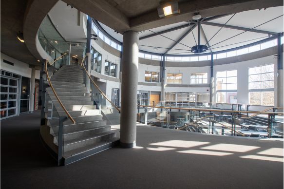 Situated at the heart of the Campus Activity Centre, this distinctive circular venue blends modern design with warm wood and brick accents—creating a striking backdrop for any event. Expansive windows fill the space with natural light and offer sweeping views of the TRU Campus Commons, bringing the outdoors in. As the building’s central corridor, this space naturally supports the smooth flow of attendees while seamlessly connecting our venues for tradeshows, cocktail receptions, and networking breaks.