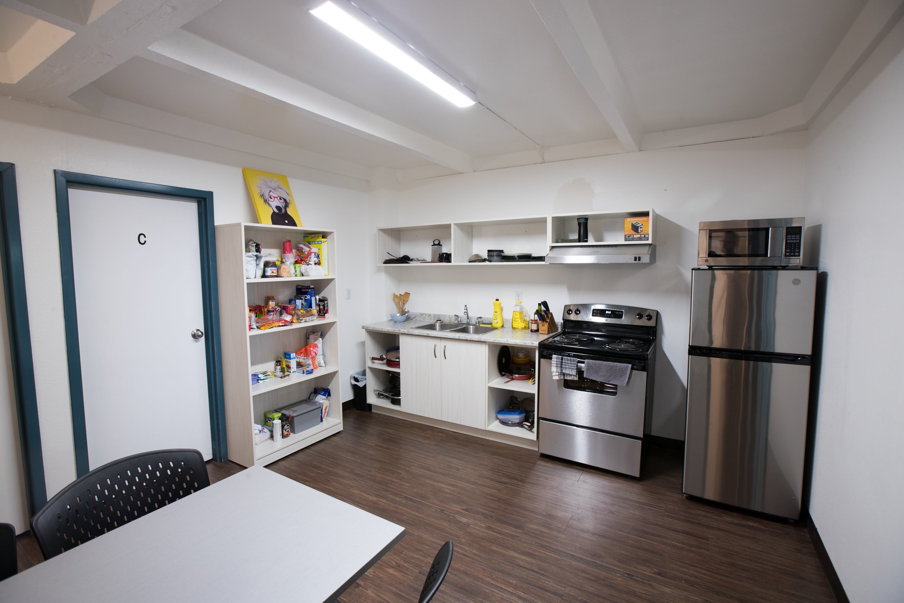 - A bed, desk, sink, kitchen with microwave, stove and fridge in each room