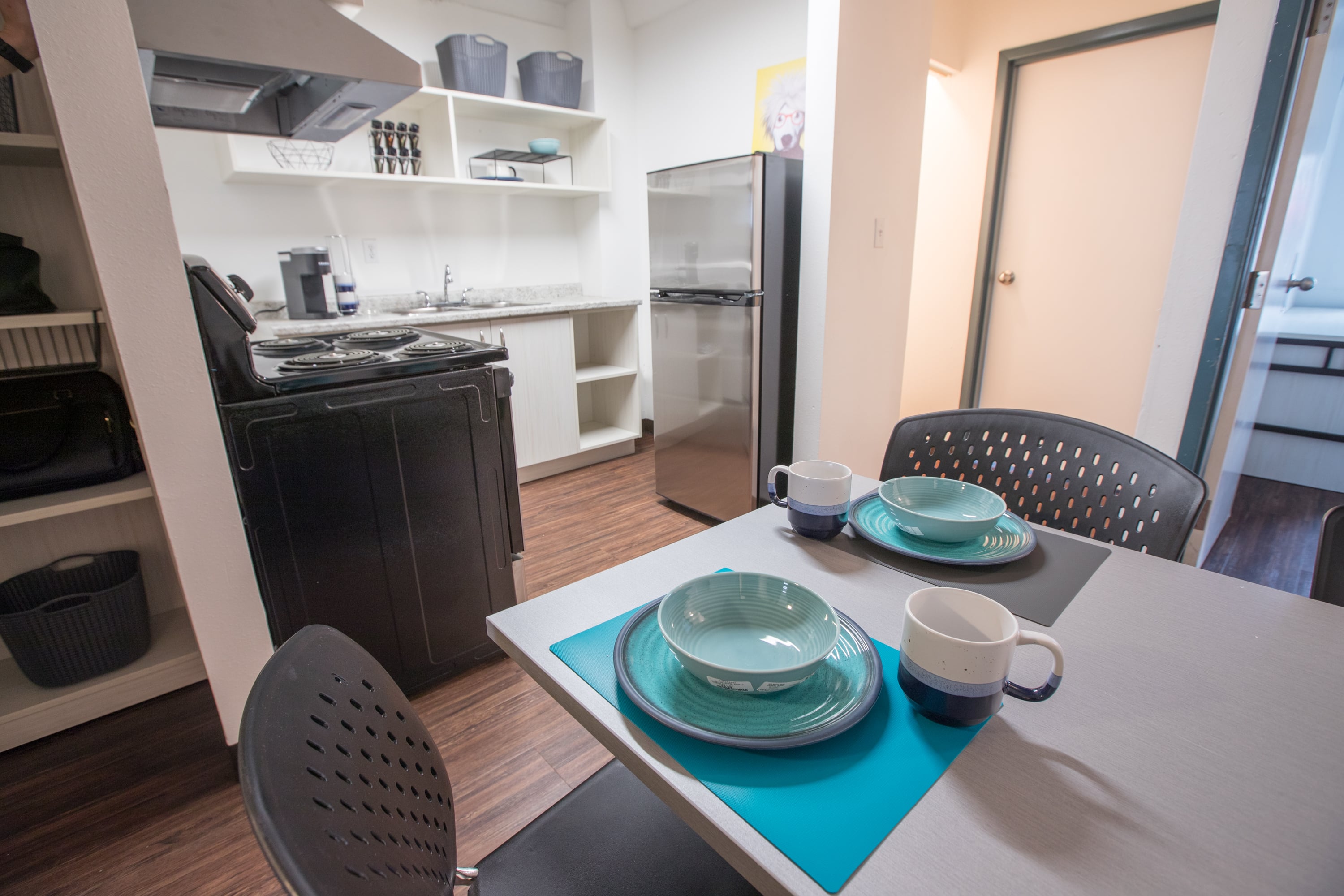 Within East Village, students can choose between four-bedroom furnished suites and a limited number of apartment style suites. Priority is given to upper year students and family’s for apartment style suites. Each suite comes with a private bedroom, bathroom, full kitchen and dining area.