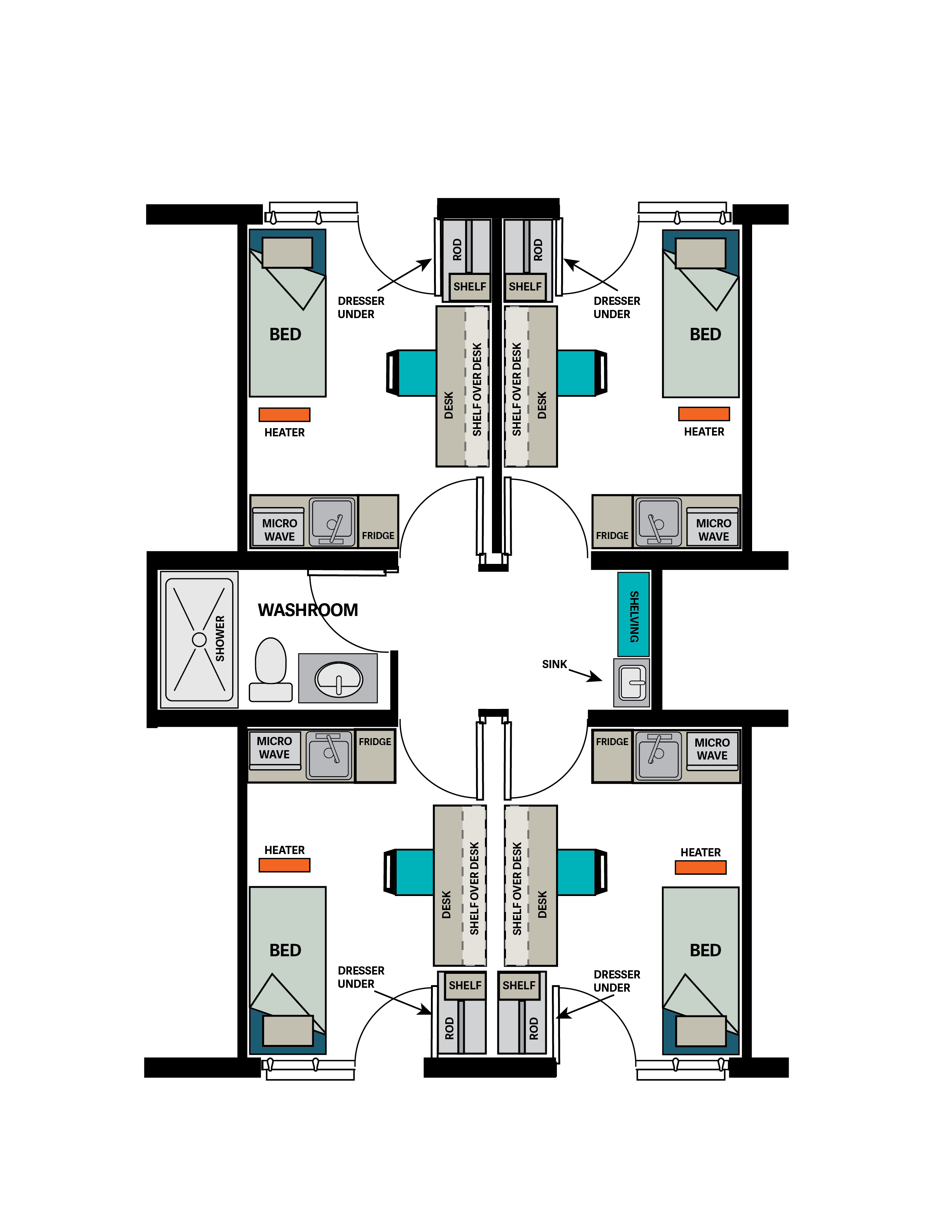 McGill Residence has over 300 self-contained rooms, divided into 76 units, in three buildings. Each unit shares a common area and a washroom. All residents have access to a central building with study and recreation space. Each housing unit is assigned to four males or four female students. Gender neutral units are available upon request.