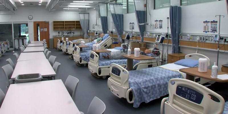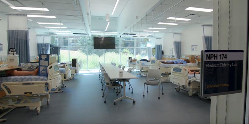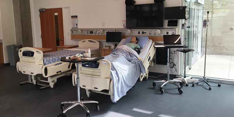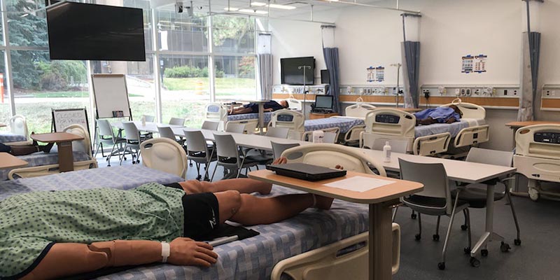 Our simulation and lab spaces are designed to look and feel the same as real practice settings, and feature hospital and community environments complete with oxygen and air flow meters, suction equipment, and ceiling tract lifts. An apartment equipped with functioning appliances and a fully functioning bathroom with assistive devices is available for learning community care. All these spaces are supported by high resolution video cameras to facilitate student learning, evaluations and debriefing. Student practice is facilitated using high-fidelity mannequins that respond to interventions and patient actors.