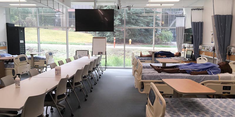 Outfitted with 16 beds and basic technology to resemble a hospital ward. Here, students practice basic assessments and case scenarios. This space is a key component to applying, practicing, and studying skills as they are being learned in class.