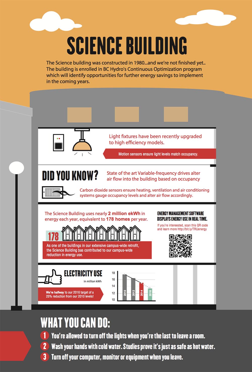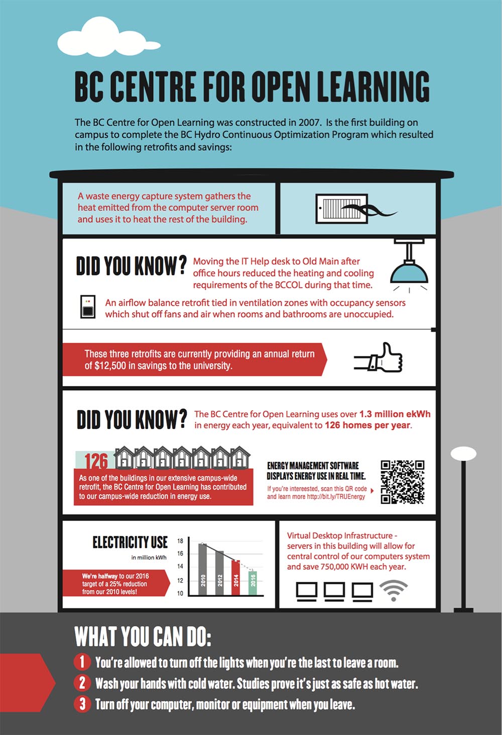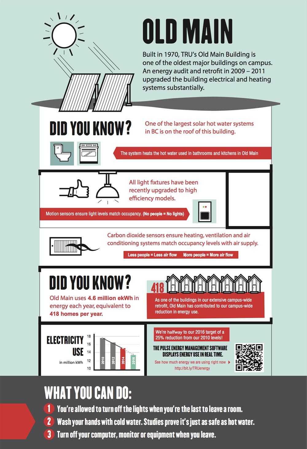 TRU's Old Main building, built in 1970, is one of the oldest major buildings on campus. A comprehensive energy audit and retrofit in 2009-2011 upgraded the building electrical and heating systems substantially. Renovations on the outside of the building further increased the energy efficiency of the heating system.