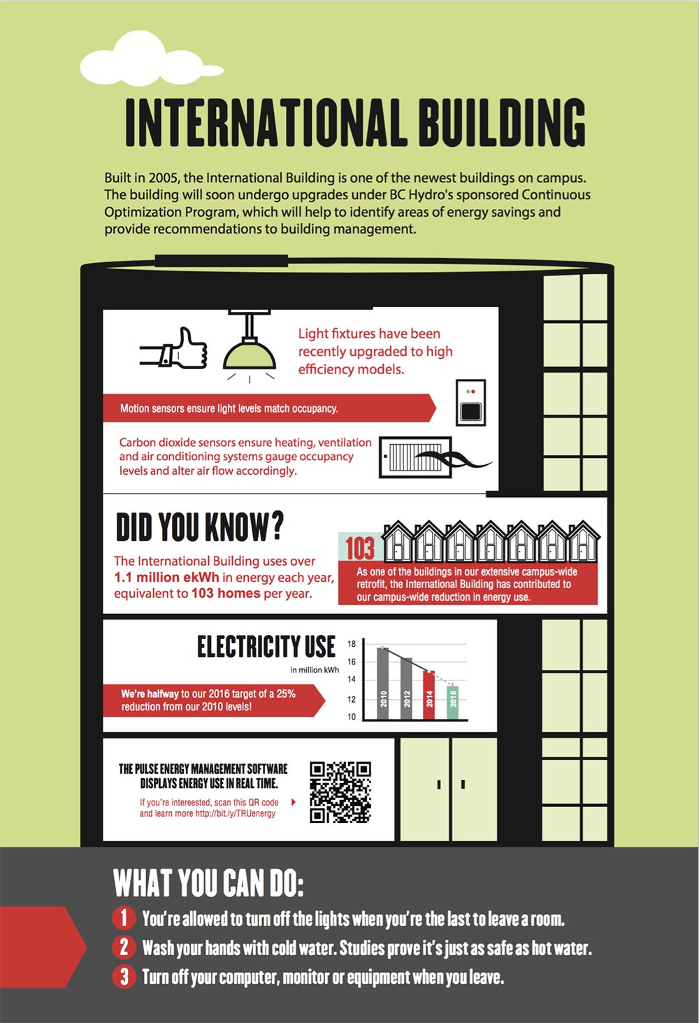 Built in 2005, the International Building is one of the newest buildings on campus. International Building has been upgraded under BC Hydro's Continuous Optimization Program. This is an ongoing building maintenance program sponsored by BC Hydro that brings in consultants to identify areas of energy savings and provide recommendations.